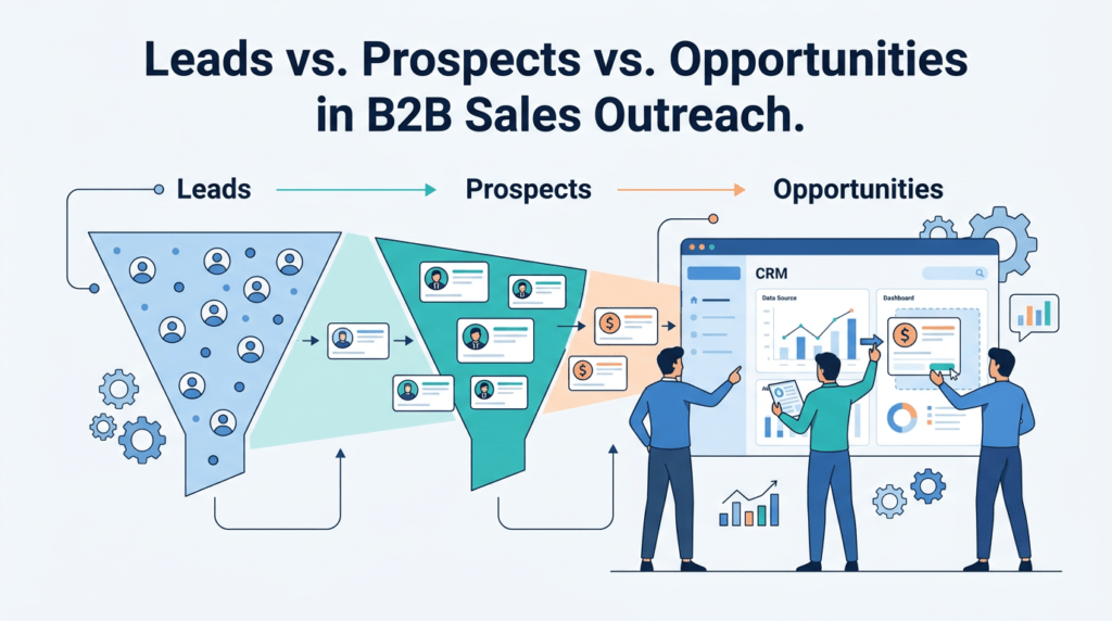 Here, Leads vs. Prospects vs. Opportunities in B2B Sales Outreach transforms from theory into revenue impact: inaccurately created opportunities inflate pipelines, mislead executives, and waste sales cycles. Real opportunities usually have: